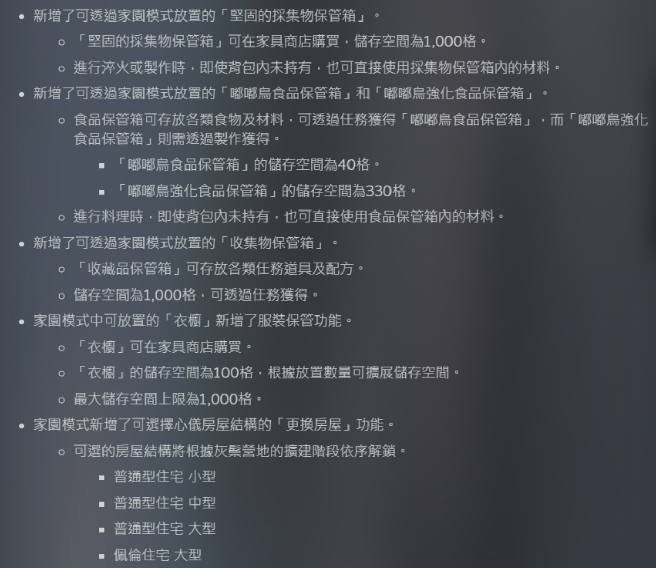 這次也優化了我們的道具欄,可以發現終於出了標籤可以分類我們的道具了,另外在我們的小屋那邊可以放儲物箱,總共有三種。