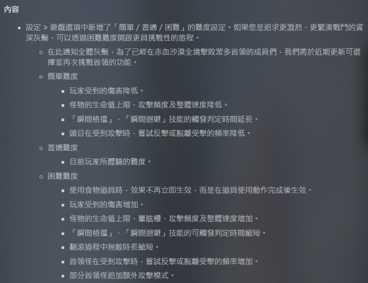 更新裡比較值得提的,如之前宣布的一樣出了難度調整,其實無外乎就是格擋跟閃避的窗口時間增多或減少,王的生命、攻擊頻率依照難度做調整,其中一條比較沒想到的是,困難難度時,食用料理的動作沒結束是不會補血的,就是類魂遊戲的那套做法,還有部分BOSS增加新的攻擊模式。