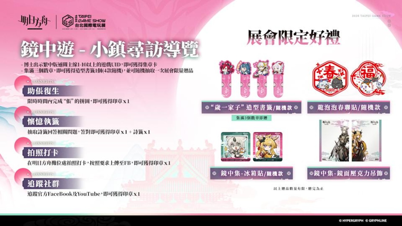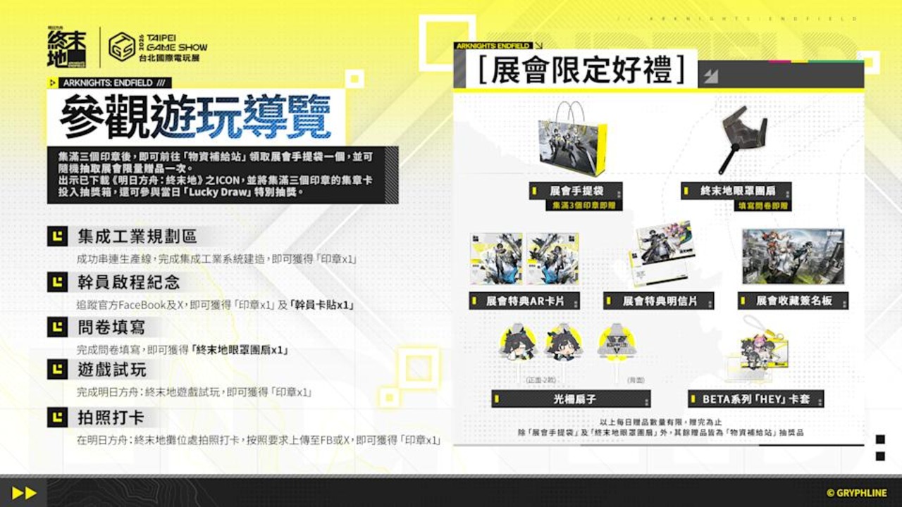 - 現場完成指定活動任務蒐集印章並兌換隨機限定周邊,包含《明日方舟:終末地》手提袋、AR 卡片、展會明信片、簽名板、光柵扇子與 BETA 系列卡套等。