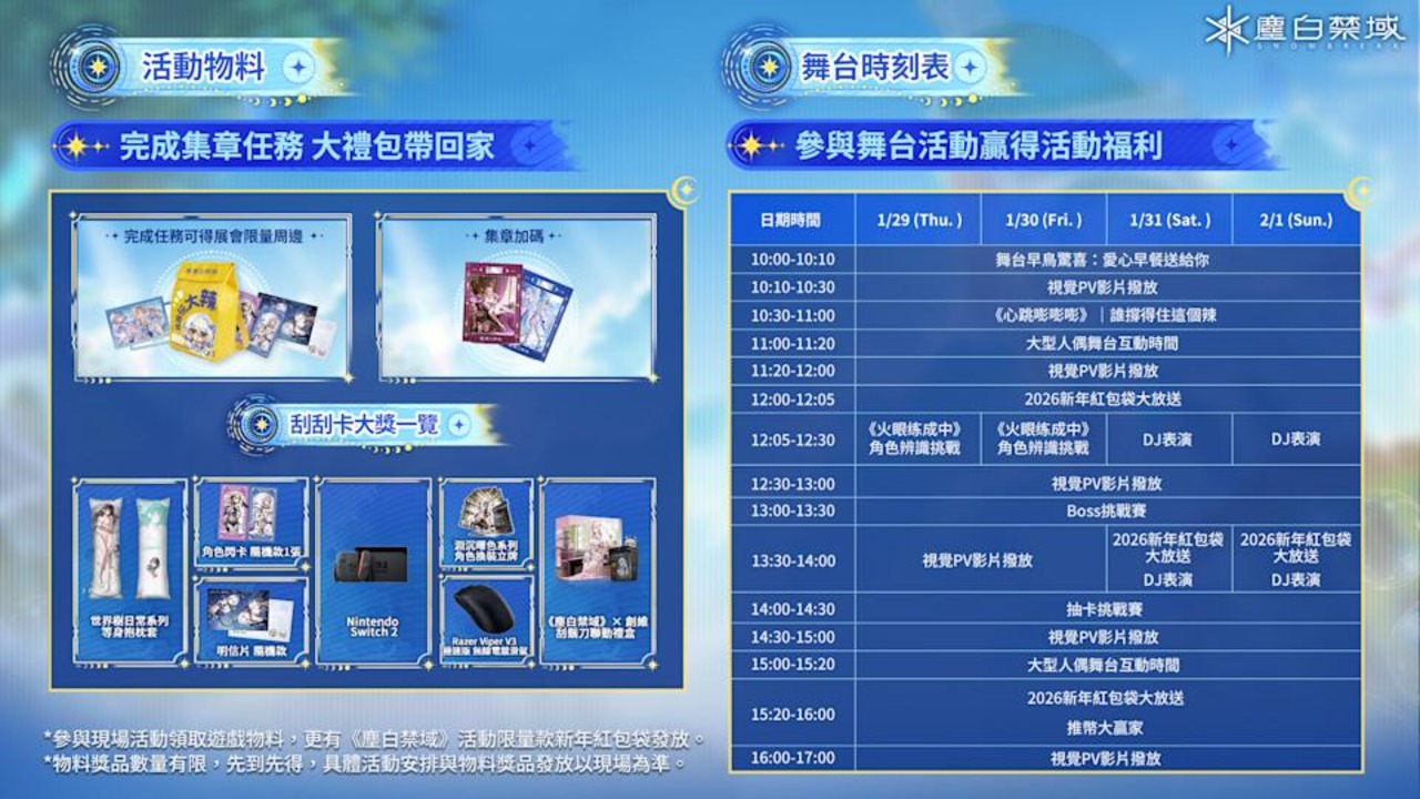 - 舞台活動:舞台帶來多項特色節目,包括抽卡挑戰賽與趣味問答等內容。凡是參與舞台活動的玩家,皆有機會獲得遊戲周邊贈禮。