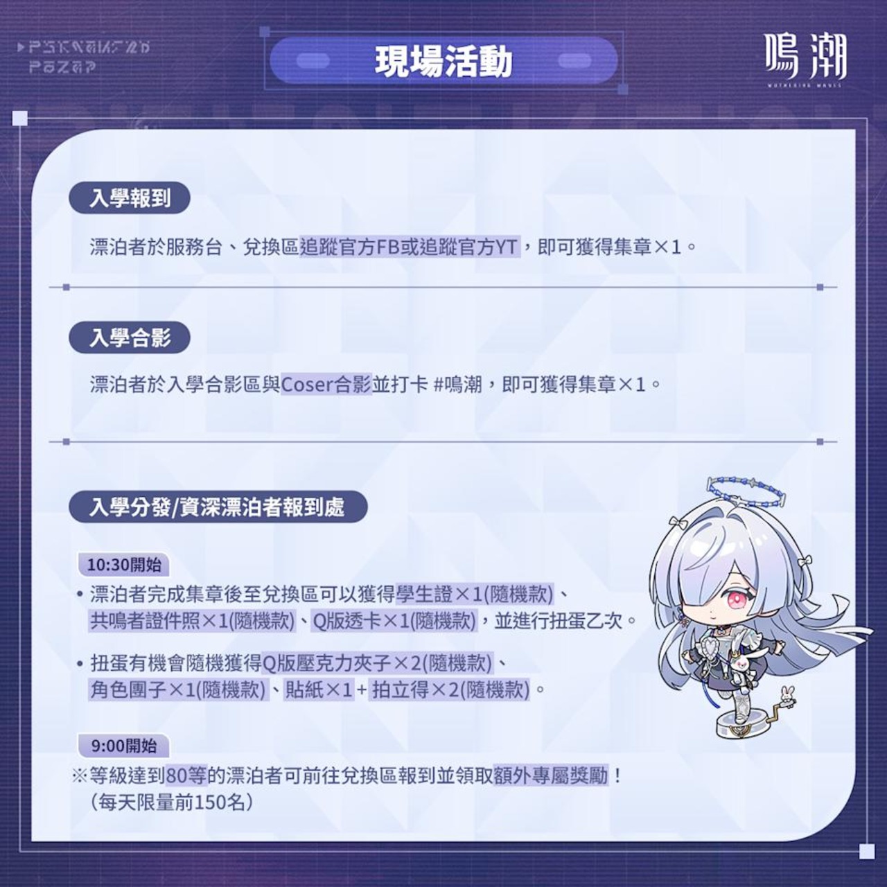 - 完成報到任務獲得入學禮包:包含學生證、共鳴者證件照與 Q 版透卡,並有機會透過扭蛋抽中包括 Q 版壓克力夾子、角色團子、貼紙與拍立得等豐富獎勵。