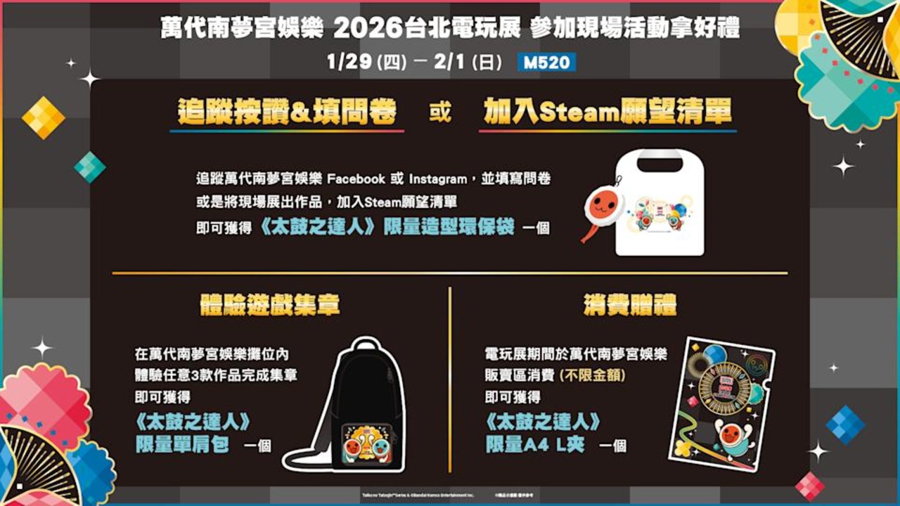 追蹤萬代南夢宮娛樂 Facebook 或 Instagram 並填寫問券或是將現場展出作品加入 Steam 願望清單,並出示給工作人員確認即可獲得《太鼓之達人》限量品牌環保袋一個。