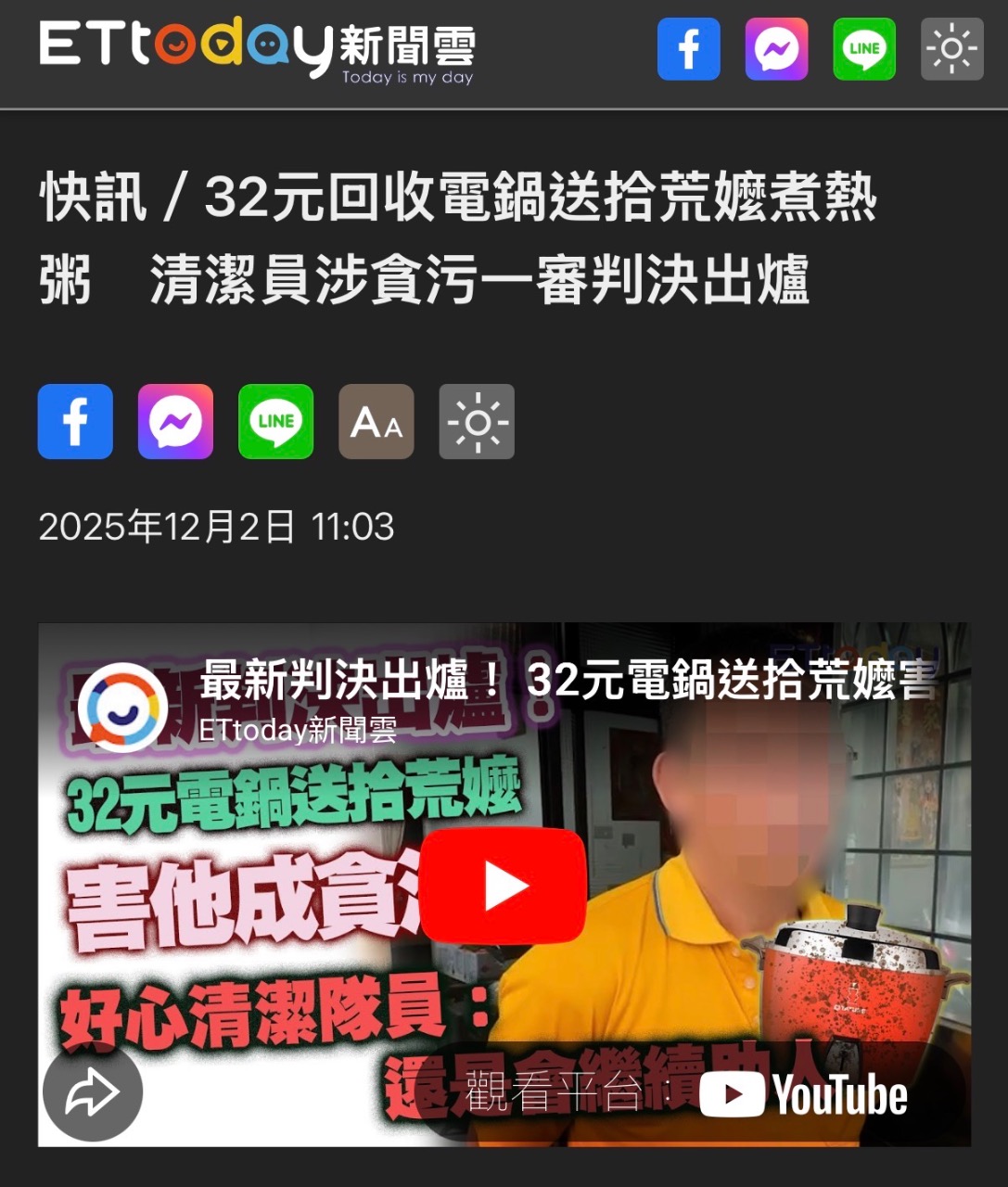 北市1名任職逾30年的黃姓清潔隊員,因將回收車上的舊電鍋測試後轉送給拾荒老婦,被依《貪污治罪條例》起訴。當時,《ETtoday新聞雲》獨家訪問黃員,他眼眶泛紅、聲音哽咽,吐露「我很後悔,好人無法做…真的」。這件案更視為「善意與法條」正面衝突的指標性案例,士林地院今(2)日11點宣判,判處有期徒刑3月、緩刑2年、褫奪公權1年。