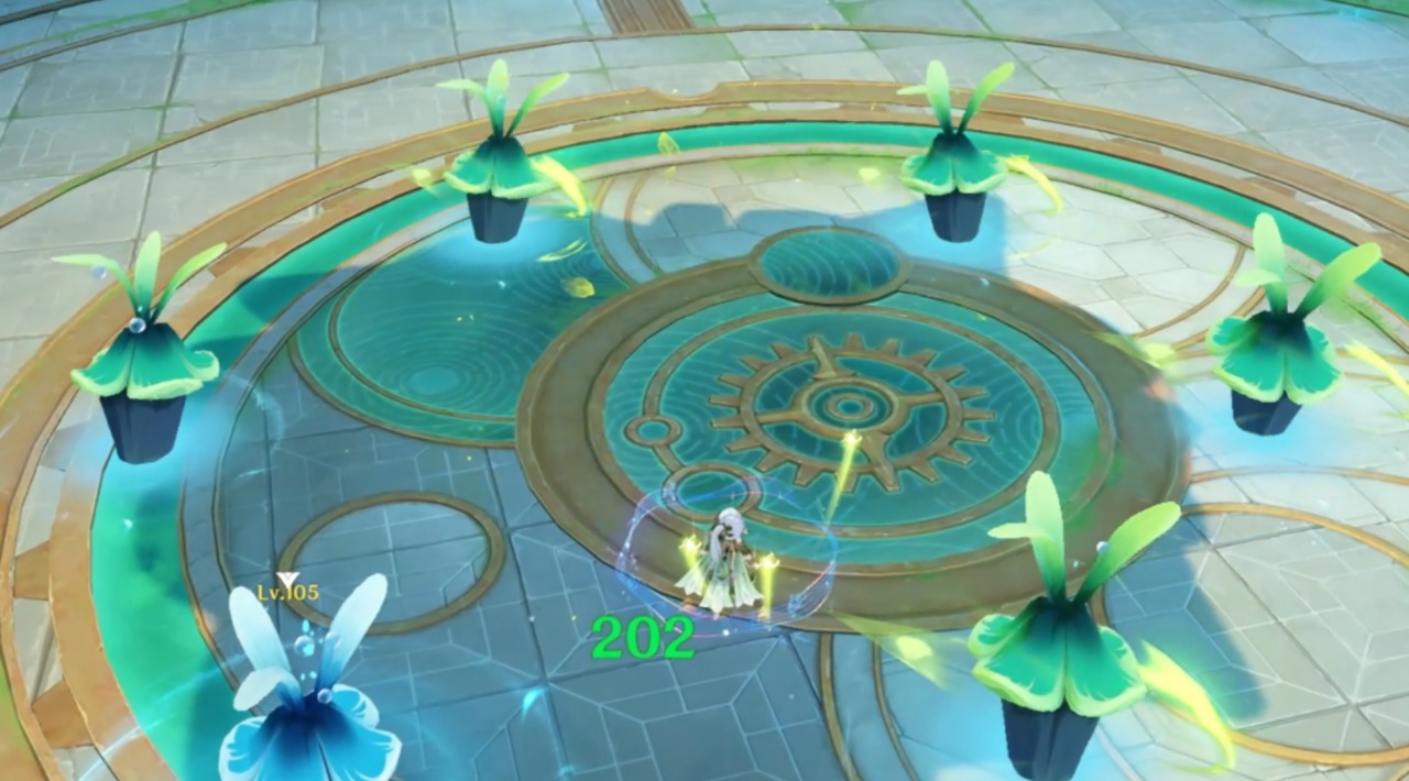 綻放的種子是有一個延遲爆炸的設定。那我們可不可在螃蟹飛天前,掛草打下來種子?等到岩居之種落下來後,直接到時間引爆,達到減少時間的目的。