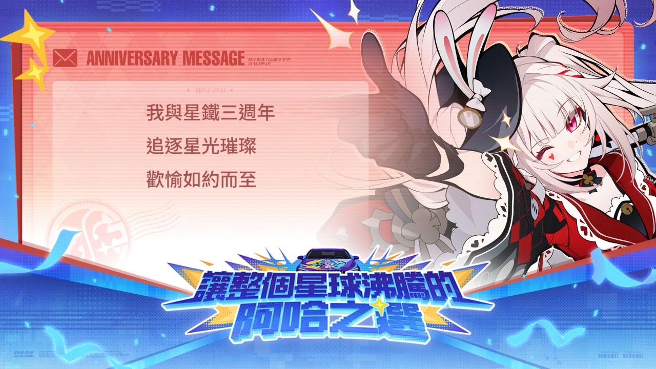 《崩壞:星穹鐵道》三週年慶典盛大開幕!登入並參與網頁活動,即可瓜分大量星瓊、遊戲內好禮。向阿哈送出三週年贈言,更有機會將「阿哈之冠」銀狼LV.999主題痛車等驚喜好禮帶回家! https://hsr.hoyoverse.com/3rdAnniversary?inviter=GA22384JEN&hyl_landscape=true&hyl_auth_required=true&hyl_hide_status_bar=true&win_mode=fullscreen&target_page=prize&utm_source=share&utm_medium=link&utm_campaign=web