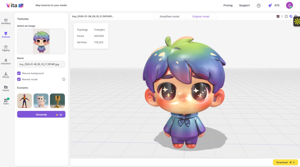 - 若需為白模上色,請點擊右側工具欄的 「Texture」。再次上傳原圖作為貼圖參考,並勾選 「Remove background」 以確保紋理精確。點擊 「Generate」 開始貼圖任務。完成後點擊加載,一個色彩鮮活的 3D 角色便大功告成了!