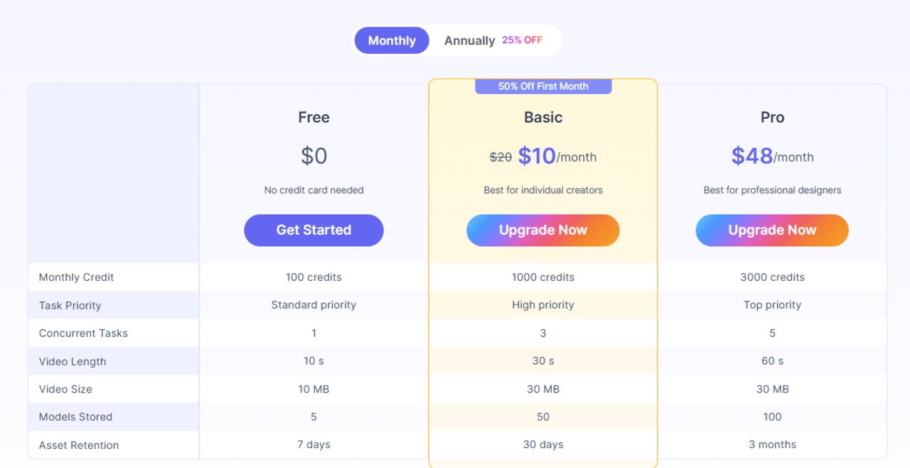 - 免費方案 (Free Plan):每月自動送 100 credits,可完整玩生成3D模型、貼圖、自動綁骨、動作生成、下載、動作捕捉等功能(每項主要操作耗 10 credits,約等於10次完整流程)。超適合新手先試用!