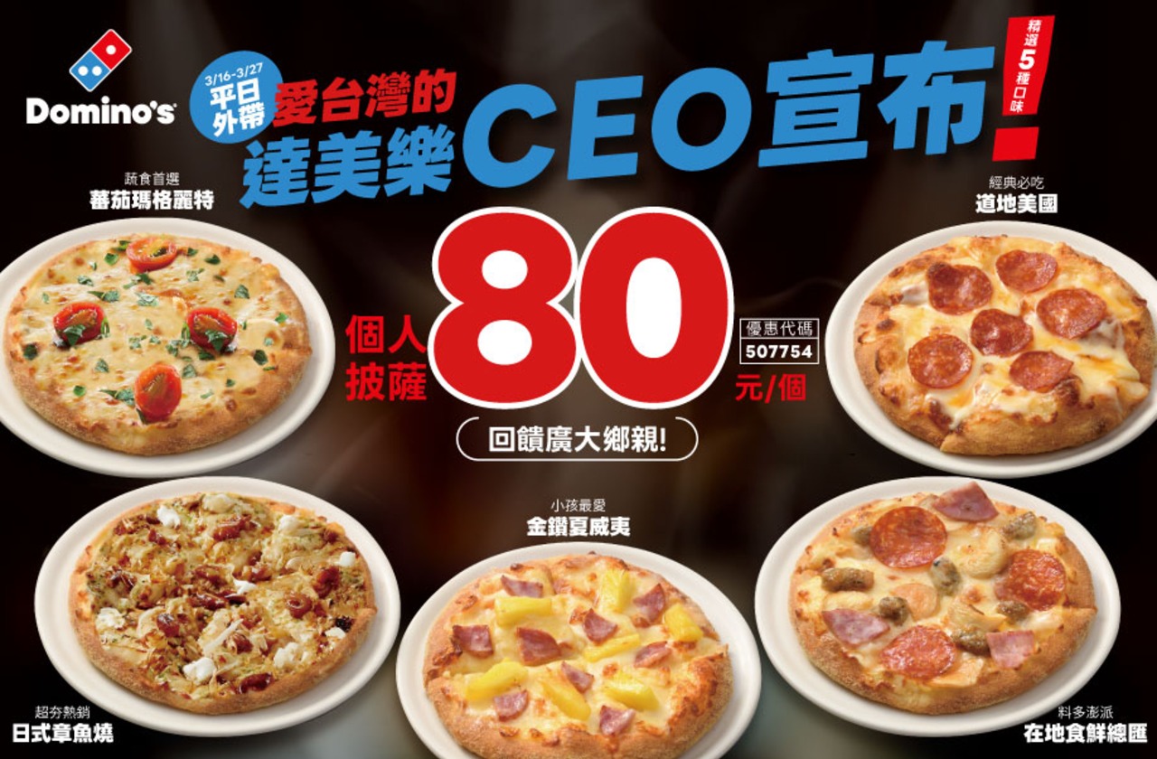達美樂推出超殺優惠,平日外帶「個人披薩只要80元」,全台門市、官網與APP同步適用。 輸入優惠碼「507754」,瑪格麗特、夏威夷、章魚燒等人氣口味通通適用,消息曝光後立刻掀起搶購熱潮。 📌 限平日外帶,想吃建議提早訂!