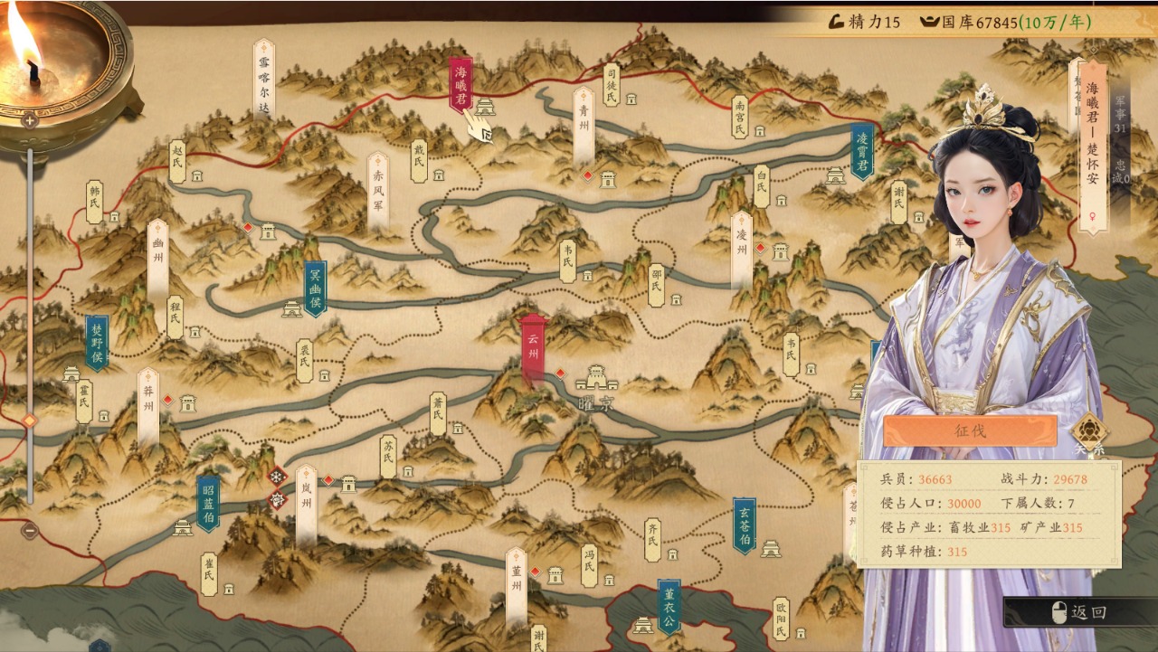 地圖之上盤踞著「世族門閥」與「割據封君」兩大敵對勢力,調兵遣將、率軍出征擊潰敵軍,即可將其掌控的人口與產業資源悉數收歸國庫,壯大國家綜合實力。