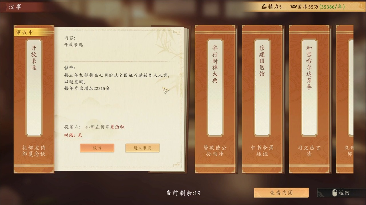 朝中大臣會不定期呈上各類新政提案,你需憑藉縝密的論證分析與精妙的利益平衡之術,遊說同僚贏得支持,最終在內閣朝議中達成共識,推動新政落地實施。