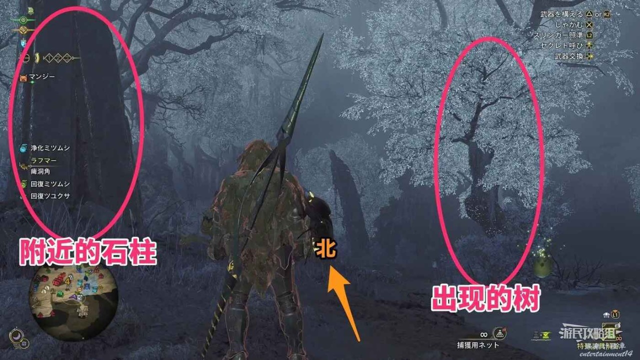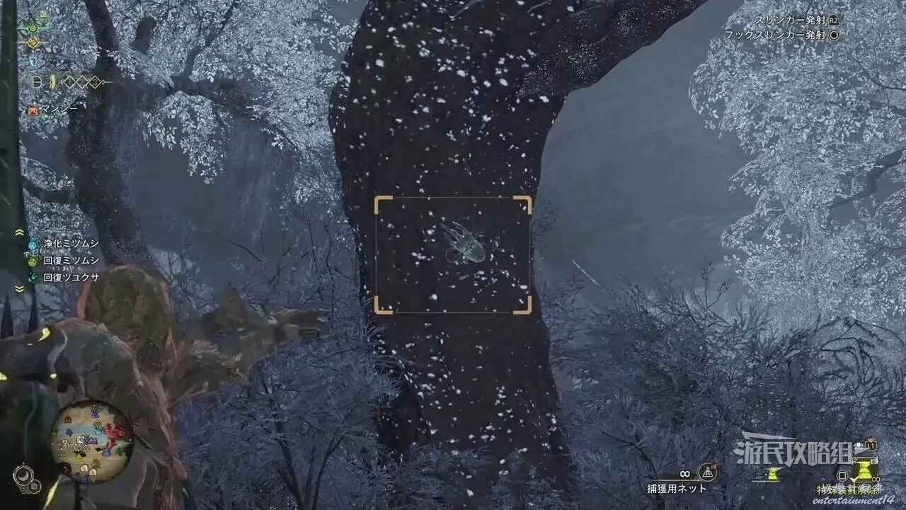 調整完時間後,前往虹色大獨角仙出現的位置,需要注意,如果距離太近它就會逃跑,儘量繞道走,離樹遠一點觀察。確定虹色大獨角仙出現後,使用【隱身衣裝】靠近,然後即可使用捕獲網捕捉。