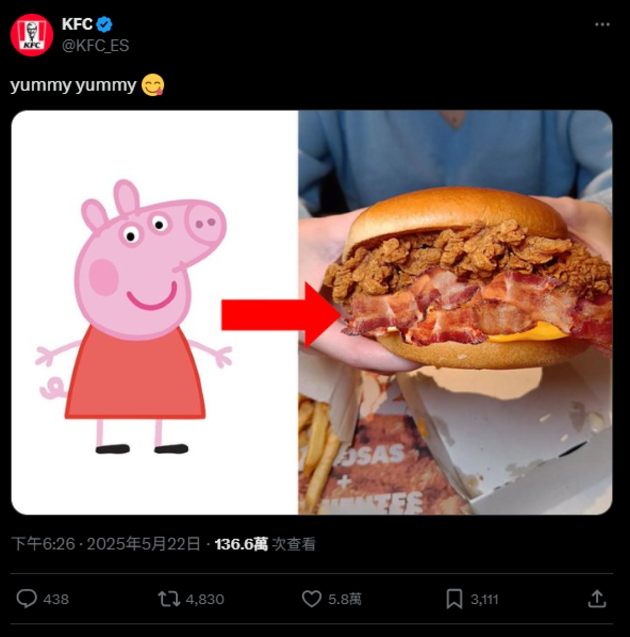 西班牙肯德基發了一張佩佩豬和培根漢堡的合照, 還配上「yummy yummy 😋」的留言,結果讓網友們震驚不已。 剛好就在幾天前,佩佩豬的媽媽才剛生下小女兒伊薇,這樣的發文不禁讓人聯想……該不會是在暗示什麼吧 O口O KFC