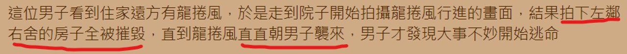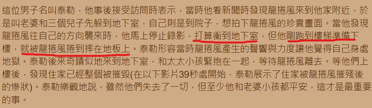 最後一刻被捲起來打傷才爬回地下室避難 家被捲沒了... 連結 超可怕 被捲過都有心理陰影
