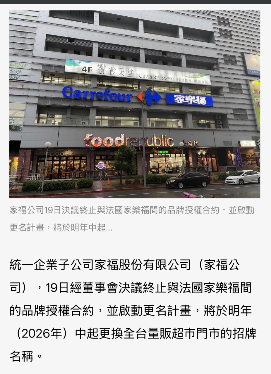 這次要叫什麼?大7-11、大樂福、大家樂 統一表示,家福公司自2023年7月起由統一企業集團百分之百持股,經歷兩年多的融合交流,已成為統一企業集團大家庭重要成員,透過集團挹注資源及導入穩健扎實的企業文化,逐步調整體質,蓄積實力以追求未來成長。在此過程中,家福公司深知台灣本土零售通路市場已和過去大不相同,法國家樂福的經營理念及管理模式亦與統一企業集團有所差異,若調整品牌策略,將有助於提升決策自主性,使家福公司能更即時回應在地市場需求,並更有效落實統一企業集團對於長期發展的整體規劃。