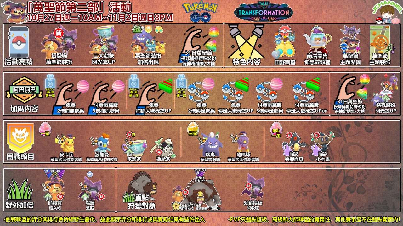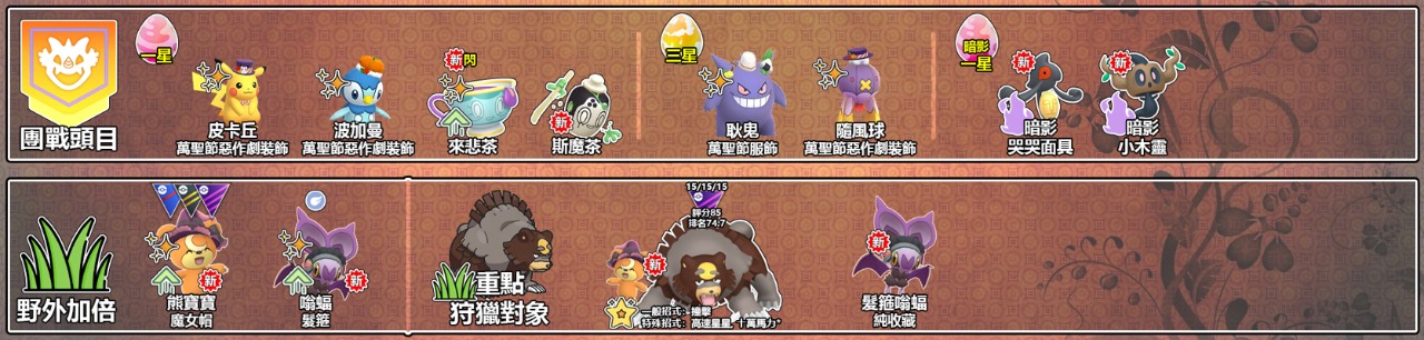 (除了初登場的魔女帽熊寶寶和嗡蝠,過往的特殊裝扮對象如魔女帽呱呱泡蛙或萬聖節惡作劇裝飾皮卡丘也是必不可少滴)