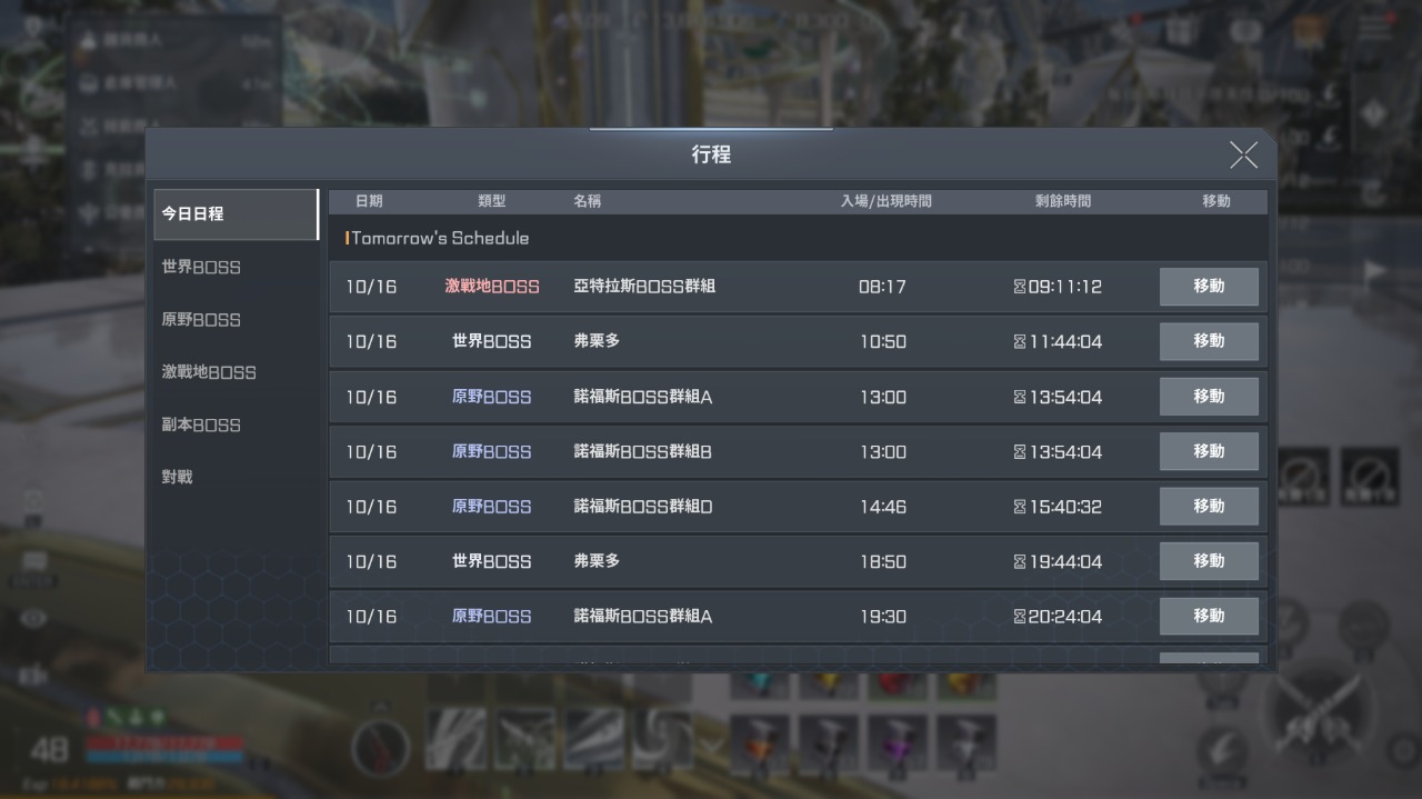 挑戰世界BOSS、原野BOSS、激戰地BOSS和副本BOSS都可以點左邊時間的標示進行行程的介面,就可以知道各BOSS出沒的時間。世界BOSS每天有張免費的1張世界BOSS入場券,記得找正確入場時間用掉,可以利用每日免費1次召喚的MAU(10分鐘)打世界BOSS拼傷害,不過發射器就不用召喚了,因為發射器會判定不出目標進行攻擊。原野BOSS常常會2組同時開,A組目前怪物都是直接被秒殺的,而且大部份都是依照順序打,最好搶快在殺死就快速移動打下一隻,同時開放的另一組也可打,最少摸到一下拿基本的冒險幣。