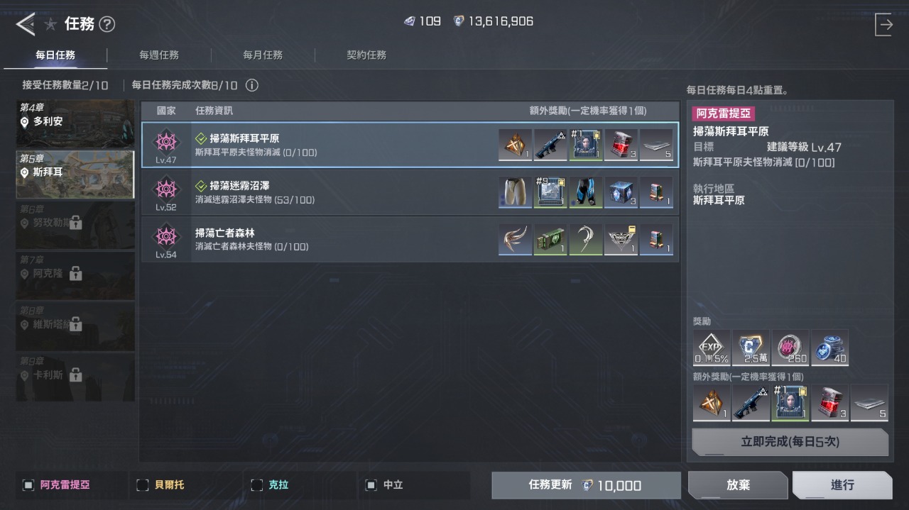 每日任務可以一次接滿(10個),掛機自動戰鬥可以放著一路做完,每週任務(4個)可以考量抽生化戰甲、漫遊者的任務和喝加速藥水,以及討伐怪物或世界BOSS都比較容易完成,不過抽卡(每日商城C幣購買)和打世界BOSS(每日1次),最少登入5天都做才能完成,每日任務總合24次的賞金任務也能考量。