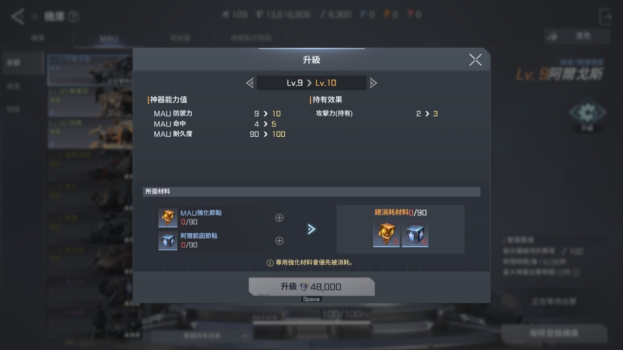 機庫的MAU和發射器,有就解鎖,因為持有效果也會加給角色,而且也盡量往上強化,各MAU和發射器都會等級上限設定,不過如果MAU和發射器解鎖的的多,強化的阿爾凱因節點有限下,可以考量持有屬性和主要使用的優先投入。阿爾凱因節點功能很多,戰鬥模組啟動能力值和裝備改究極改造增加額外屬性也用的上,目前主要獲得的管道是分解稀有以上的裝備和繼承者訓練所,以及活動和任務等,所以可能要考量分配的情況,究極改造可以先開,因為新手拿的到新傭兵系列會用上一陣子,可以先附點額外屬性上去。