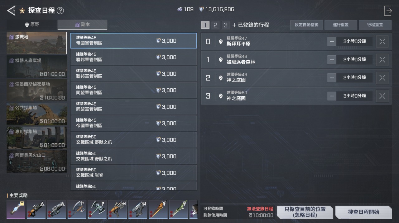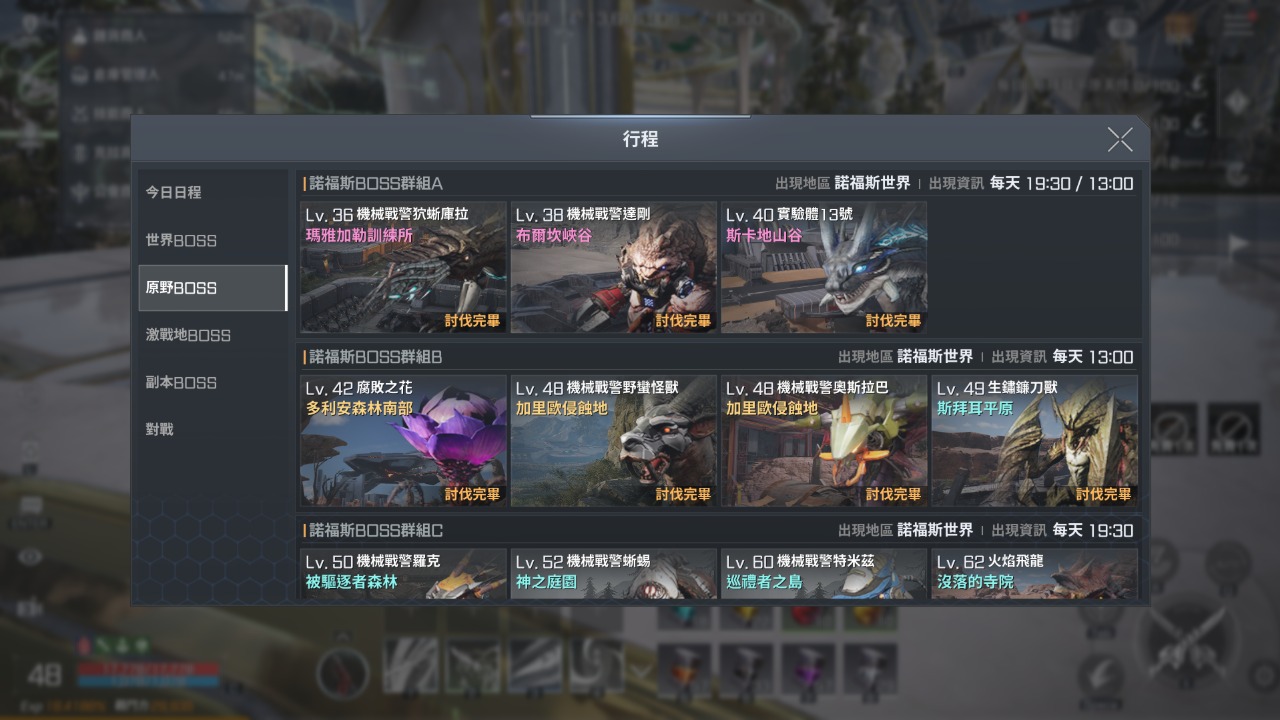 副本BOSS週2和6會出,激戰地則也是照表單上出生,不過目前玩家等級打不太過,所以激戰地的BOSS幾乎都長期存活。冒險幣可以跟同盟冒險幣商人買東西,推薦先存起來買被動技,其它每週更新的依需求入手。冒險幣的道具都還不錯,原野BOSS是大量取得主要的方式,記得開啟時間都打一下。
