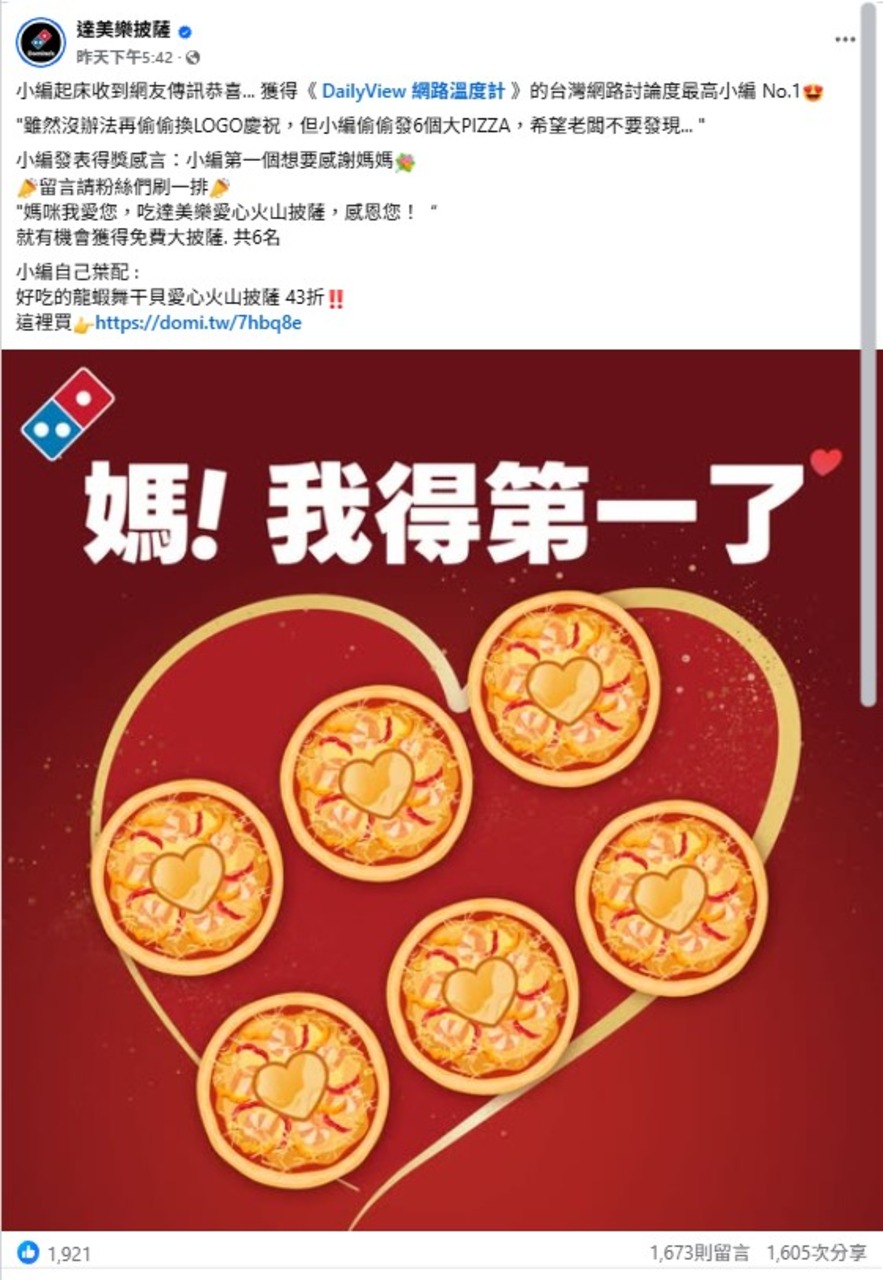 新貼文裡也發了6個大披薩,再次恭喜達美樂小編。