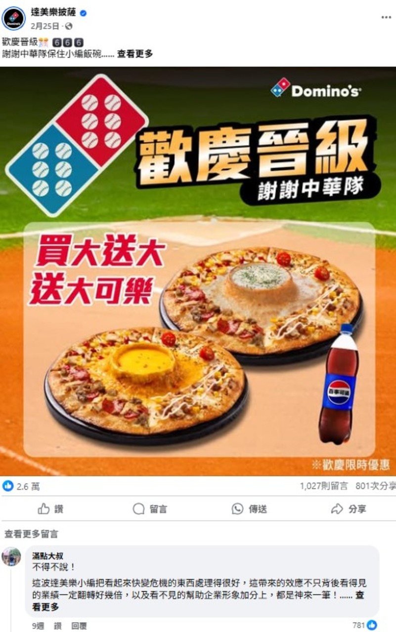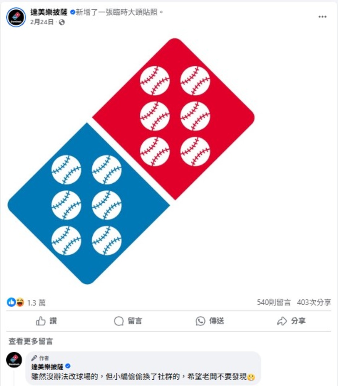 而達美樂小編第一時間在FB發布了一貼文,表示無法改球場的,但小編偷偷改了社群的,被網友們讚爆。