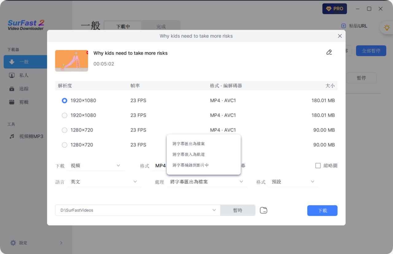 Step 3:SurFast Video Downloader 提供原畫質和其他多種畫質下載。 在彈出視窗中選擇需要的畫質,確認已勾選字幕選項,根據需求選擇字幕下載方式,點擊下載即可。