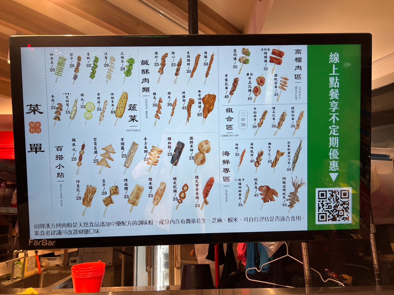 每一樣串燒下方都有牌子,若想知道自己拿大概多少錢,可對照上方菜單價目表即可,可以邊抓自己用餐預算哦。