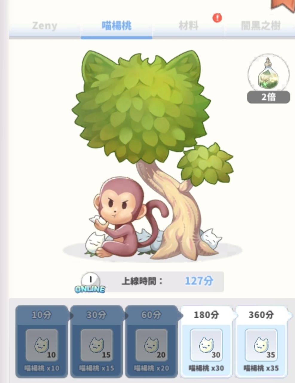 - 神木獎勵:上線 10/30/60/180/360 分鐘,分別可獲得貓幣,單日最多 110 個