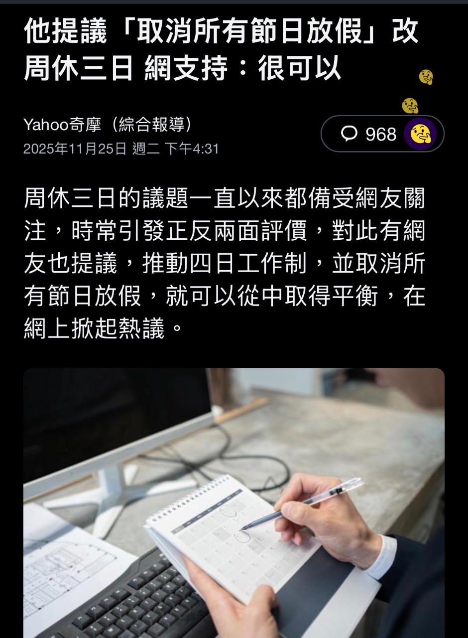 如果週休三日的代價是用扣除所有國定假日及農曆年假,各位願意嗎? 以我自己來說我還是喜歡農曆過年的長假、中秋節的烤肉假期、國曆跨年假期,如都要用來交換我寧願不要周休三日 有網友在論壇PTT以「周休三日,取消所有節日放假,如何?」為題發文,原PO表示,自己支持周休三日,且所有的紀念日、節日,包含春節全部不另放假,這樣不僅能從中取得平衡,放假也不會忽長忽短,「老實說放超過三天的假,爽度很容易邊際效益遞減,至於要出國需要長假的自己請特休,放三天再湊四天不是難事,這樣就十天長假了」。