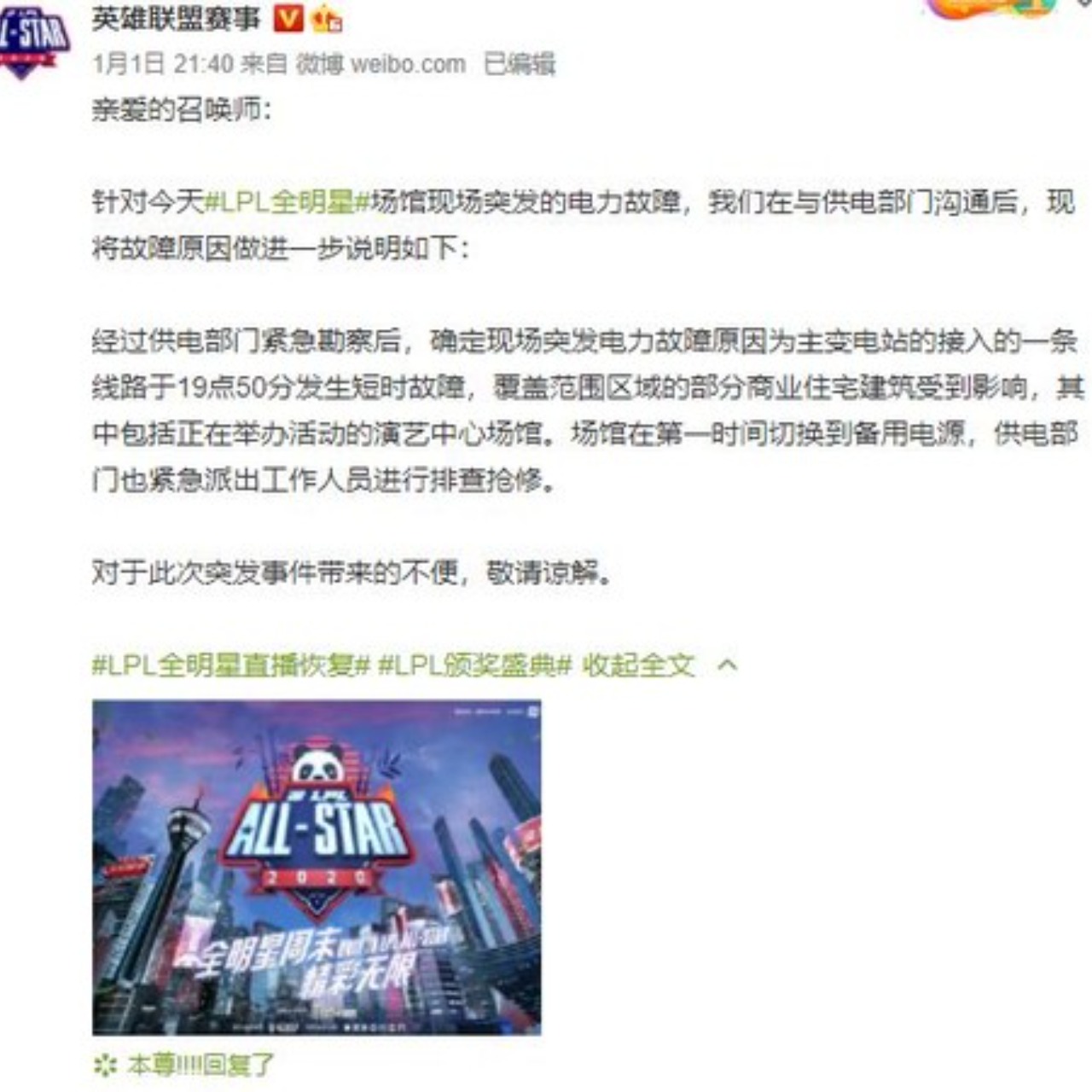 大陸成都1月1日舉行「英雄聯盟」 All Star 全明星賽(LPL),比賽進行到Solo King的準決賽時忽然全館大停電,直播、遊戲全部中斷,經一個小時搶修後,電力恢復繼續進行比賽。