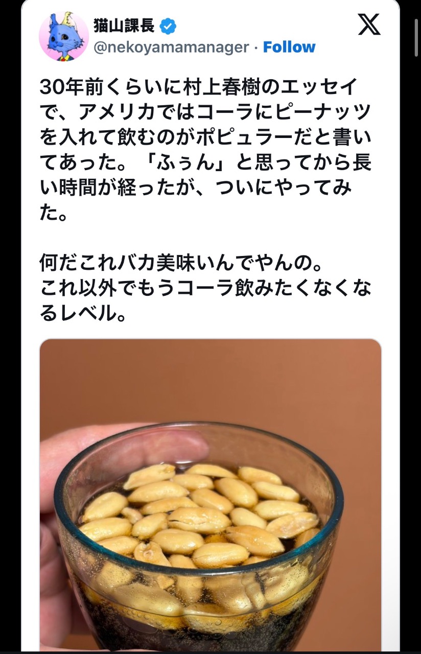 把花生倒進可樂裡?這個聽起來像惡作劇的吃法,最近竟在日本掀起跟風熱潮。這款來自美國南部、幾乎被時代遺忘的奇妙搭配,被稱為「農夫可樂(Farmer’s Coke)」,做法相當簡單,打開一瓶可口可樂,再把鹹花生整包倒進去,一杯「甜鹹氣泡特調」就完成,看似衝突的組合,卻讓不少首次嘗試的人驚呼:「回不去了!」。