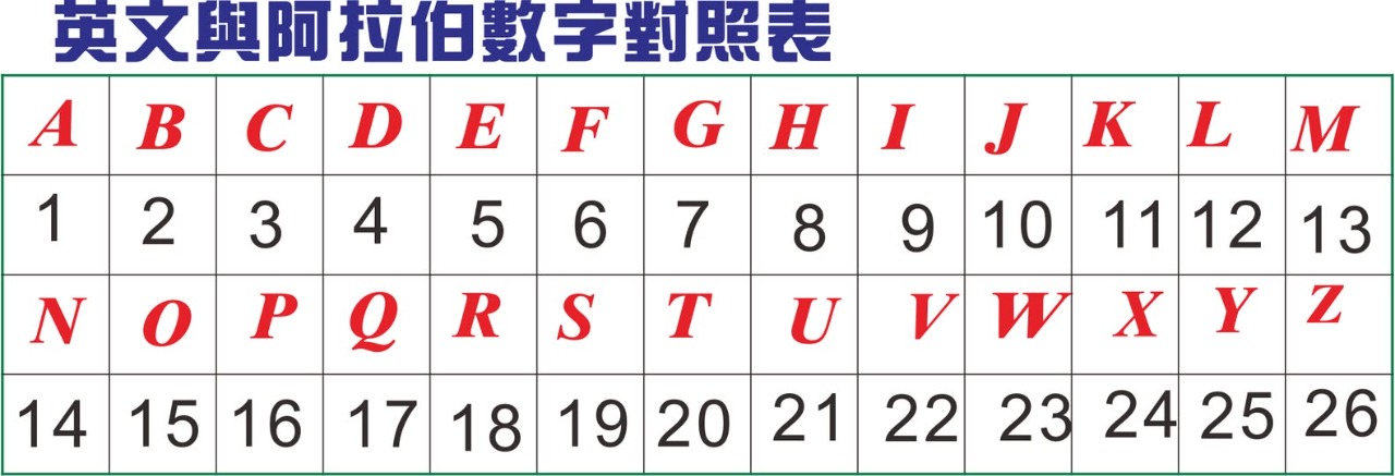 換成數字:1 2 3 4 5 6 7 8 9 10 11 12 13 14 15 16 17 18 19 20 21 22 23 24 25 26