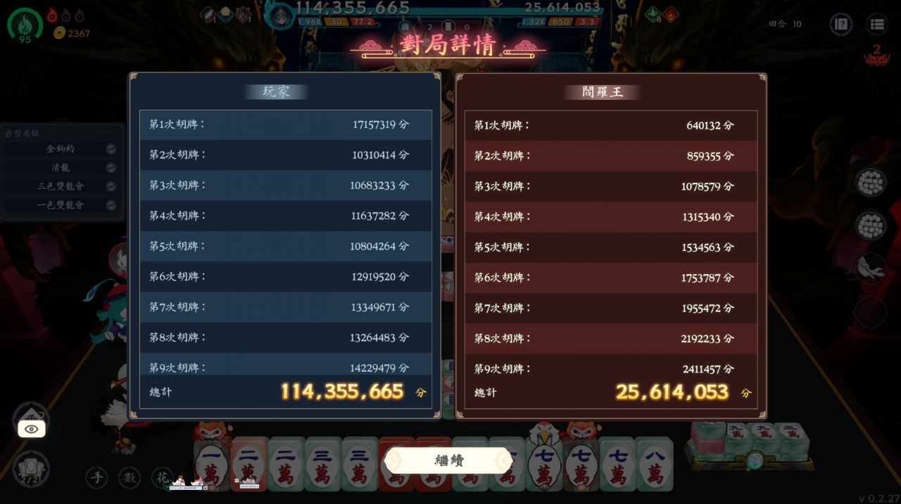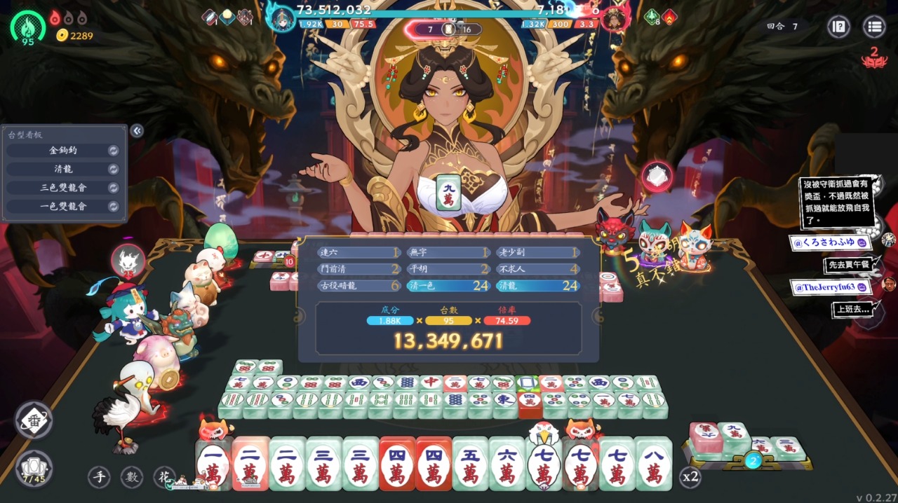 牌型的部份除了一般知道的大三元、七對子、清一色之外