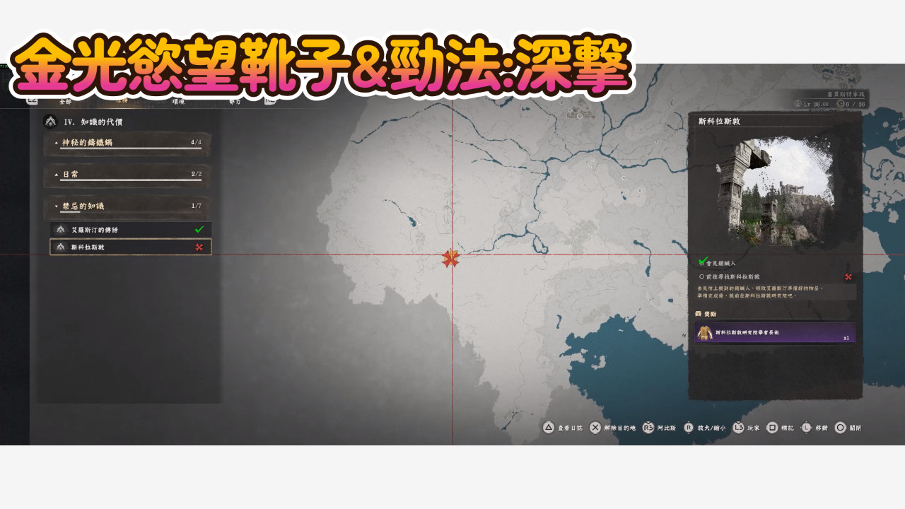 最後的靴子有點麻煩,大家要打到主線第四章,會叫你穿著研究院的衣服去找斯科拉斯敦研究院,在這個節點我們去任務的位置,在大地圖的左下方,走進去石門裡面會看到虛影,對著他按L1觀察就可以學習到勁法:深擊。