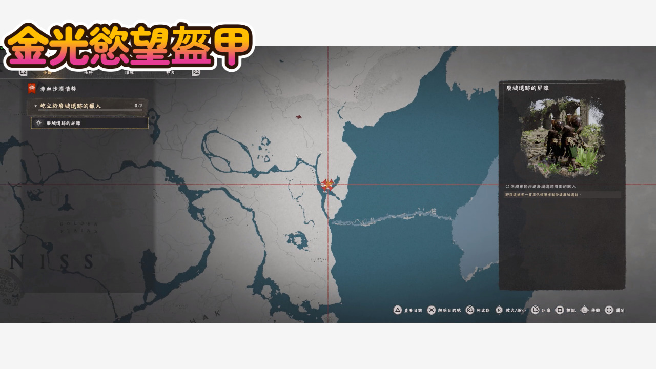 接著我們去拿金光慾望盔甲,在地圖右邊,Red River的右岸,這裡叫布勒沙達廢城遺跡,我們從正門口右邊的小路走過去,然後往右跳下去,旁邊有一個入口走進去後左轉,走到底會發現一個機關,使用勁法,就可以推門而入,寶箱就在裡面。面板是防禦力14,移動速度等級1,焠火4,額外效果移動速度+1,每秒恢復0.2生命,游泳速度+2%。