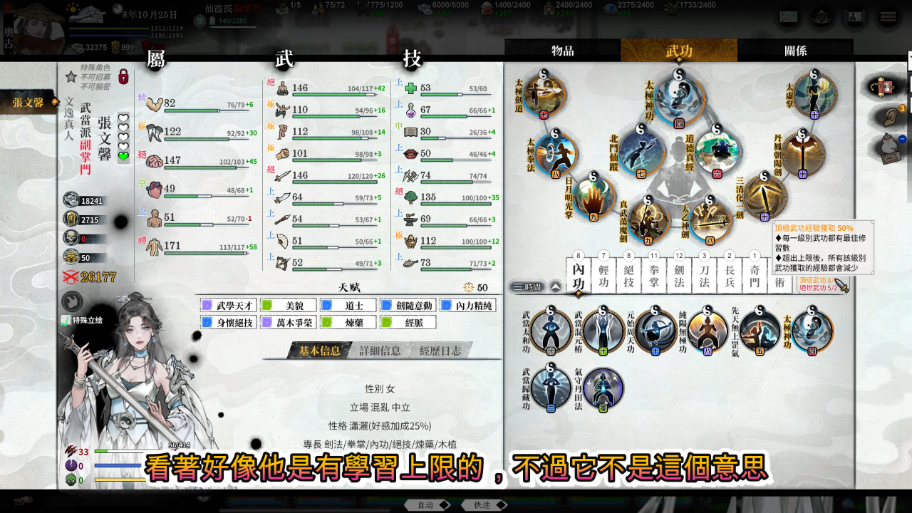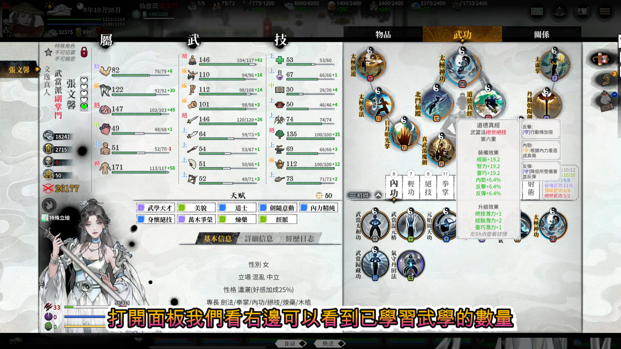打開面板我們看右邊可以看到已學習武學的數量,看著好像他是有學習上限的,不過它不是這個意思,而是超過數量後修練的經驗值會降低,代表修練的難度會比較高,但基本上超過幾個沒什麼關係,依然可以修練到滿。