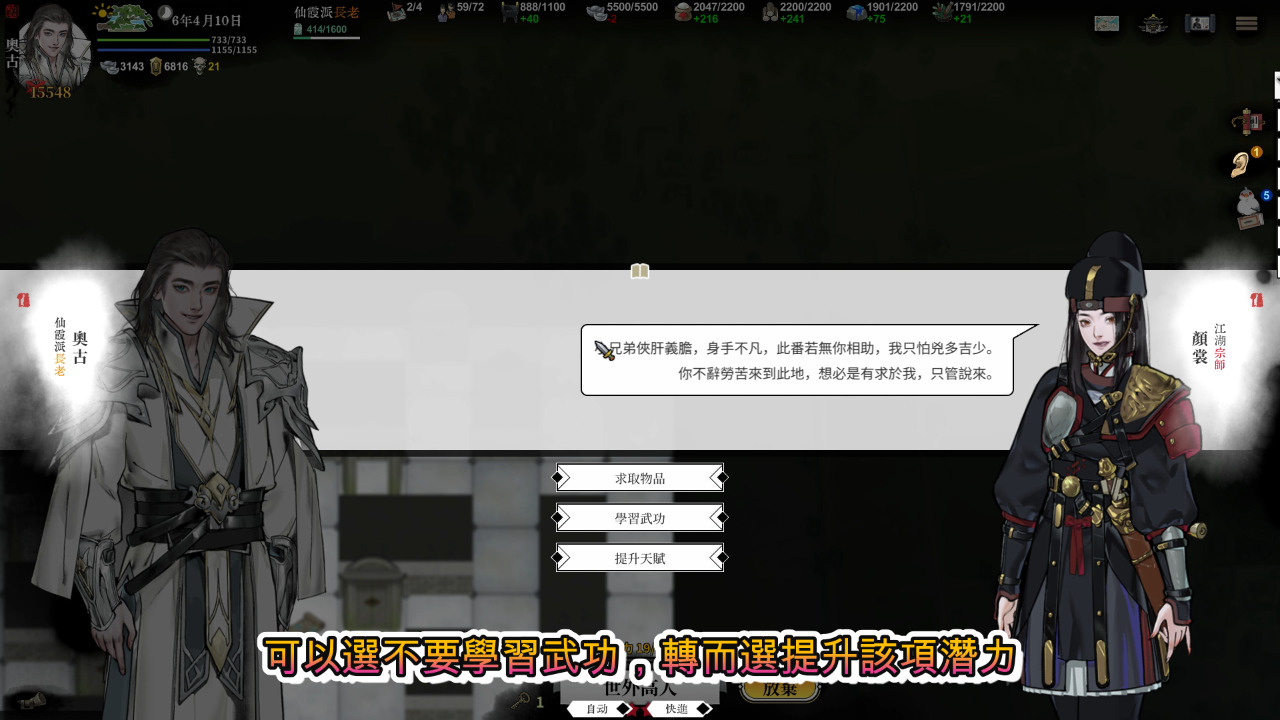 也可以找絕世高人的江湖傳聞,或者我上面講的每個迷宮探索地圖第一階段會隨機出絕世高人,可以選不要學習武功,轉而選提升該項潛力,像是劍法武學不學就會提升劍法潛力。(世外高人的傳聞不學武功的話是提升天賦點數)