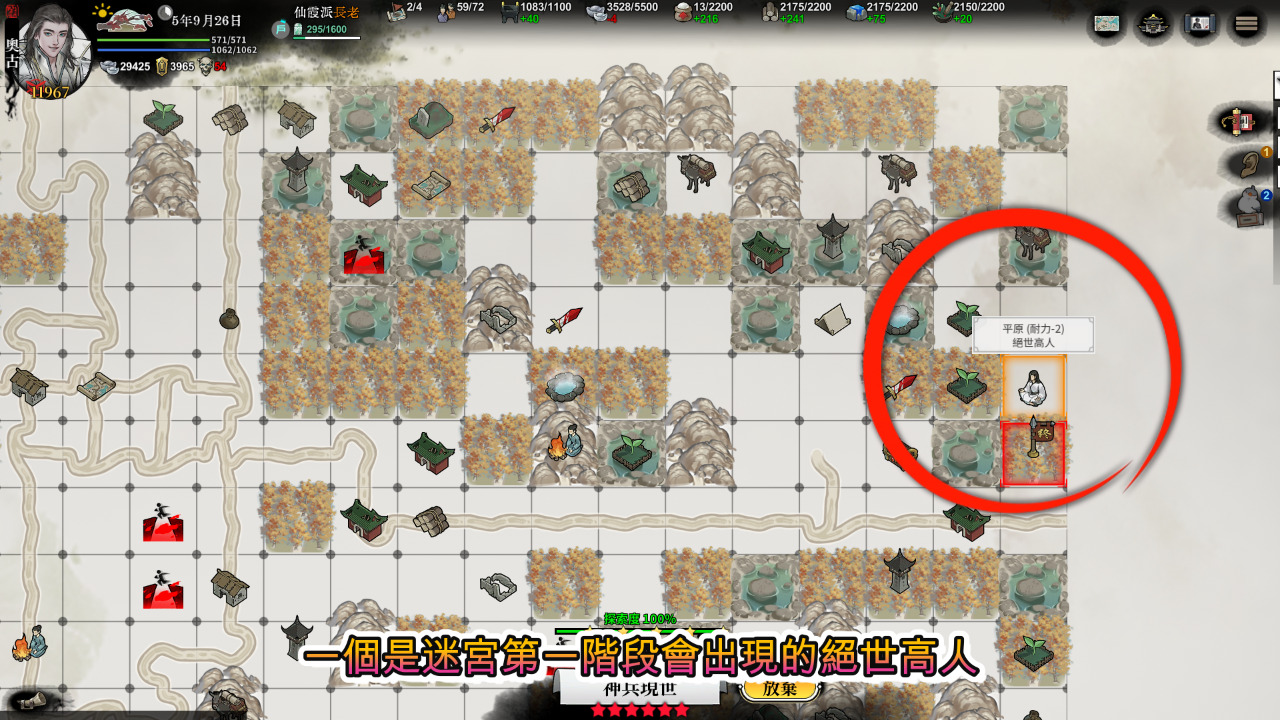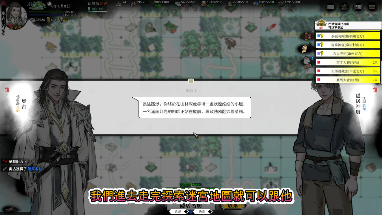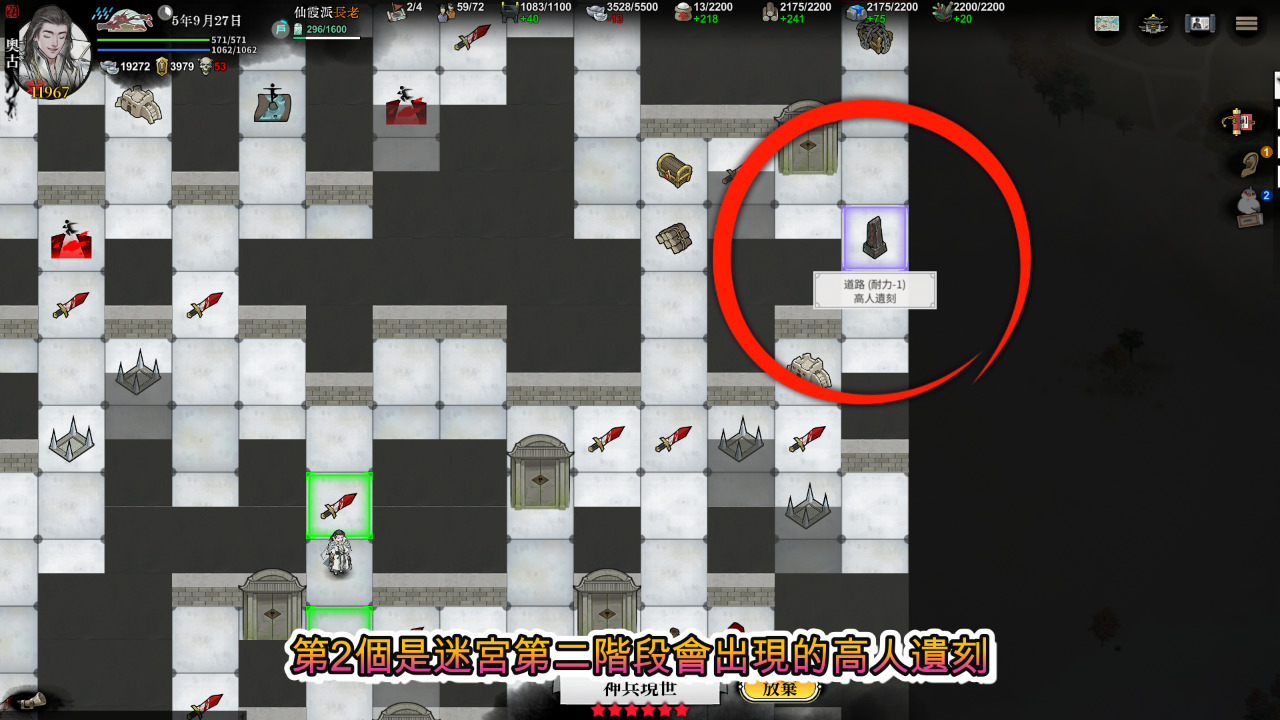 追蹤傳聞進去迷宮後,裡面會有商人販賣你需要的物資跟武學,另外還有兩種隨機出現的奇遇可以讓你學到高階武學,一個是迷宮第一階段會出現的絕世高人,第二個是迷宮第二階段會出現的高人遺刻,這兩種有看到都一定要走過去,有試有機會,就算因為數值不夠不能學,它也可以提升你的該項潛力。