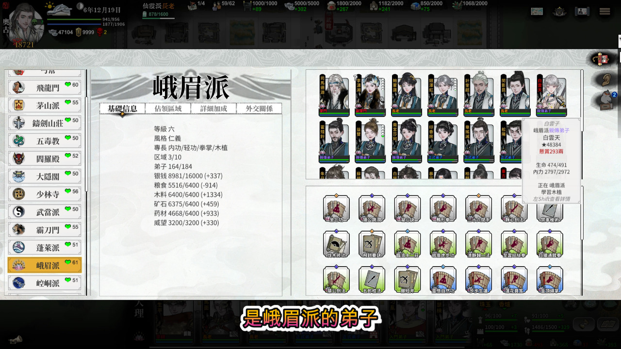 依照系統我們刷好感度就可以邀請NPC入隊伍,但是位階高的NPC刷好感度非常困難,所以差不多斷絕了中後期前找各派掌門入隊的可能,但這裡有一個漏洞,整個開放世界有一個NPC只有親傳弟子的地位,卻有天下前三的實力,她的名字叫白雲天,是峨嵋派的弟子。