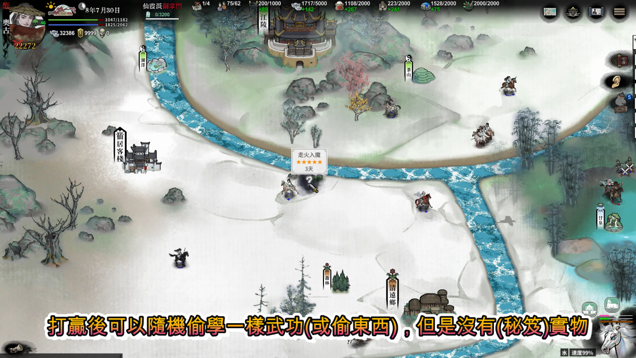 路上還有各式各樣的奇遇,有的還會遇到別人走火入魔,打贏後可以隨機偷學一樣武功,但是沒有實物,要回藏經閣默寫出來,升級時也會比較麻煩,也是另一種邪修玩法。