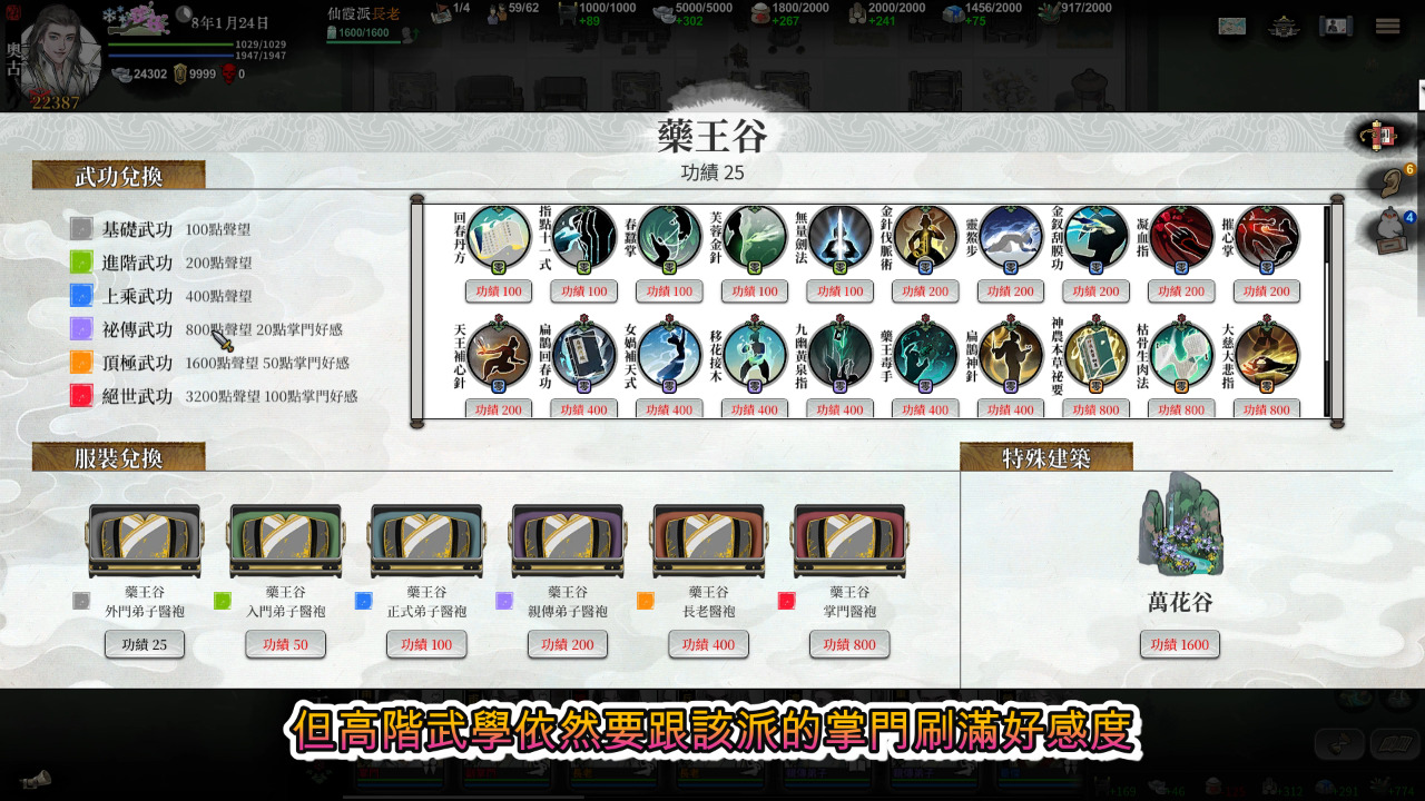 第三個方法是去解其他門派的委託來累積功績,只要去各派的正廳就可以發現這個系統,依照畫面我們可以看到只要解任務就可以兌換其他門派的武學跟衣服,但高階武學依然要跟該派的掌門刷滿好感度。