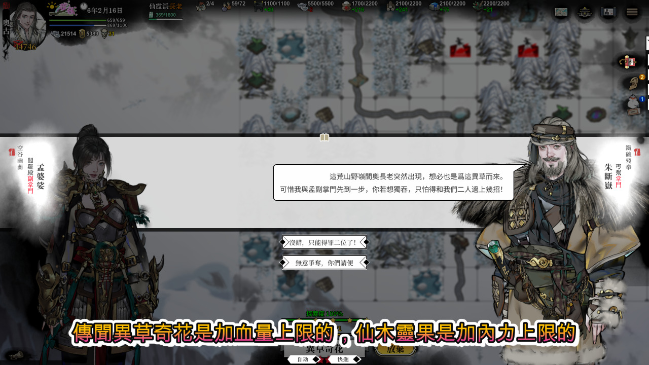 傳聞異草奇花是加血量上限的,仙木靈果是加內力上限的,但一律都是兩個掌門來跟你搶,要去搶要看看實力夠不夠,但就算不搶也可以去逛逛迷宮地圖也是不錯的,說不定遇到好東西呢!?
