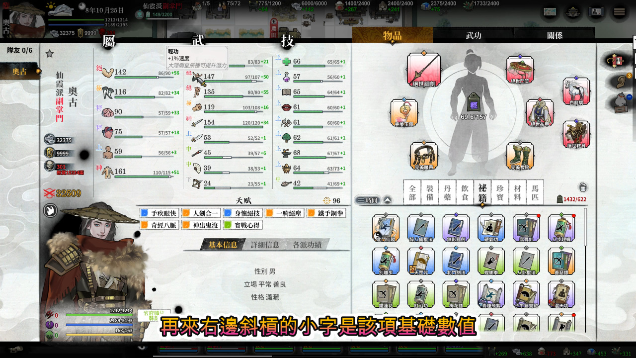 所以我們要學大量的武學來堆積自己的各項數值,在官方更新後,武學的要求數值從基礎數值改成總值,能讓我們更容易達標來學習高階武功,但那不代表我們就不需要提升我們的基礎數值了,以我47小時的經驗,基礎數值大概佔了我們一萬的功力,我目前的功力有三萬。