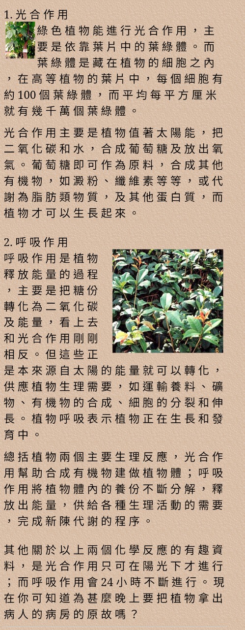 「光 合 作 用 只 可 在 陽 光 下 才 進 行 ; 而 呼 吸 作 用 會 24 小 時 不 斷 進 行 。」那是不是砍樹都要在傍晚時比較賺啊?https://www.hktraveler.com/hktree/croom03.asp