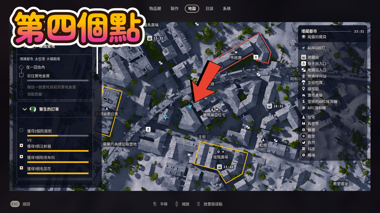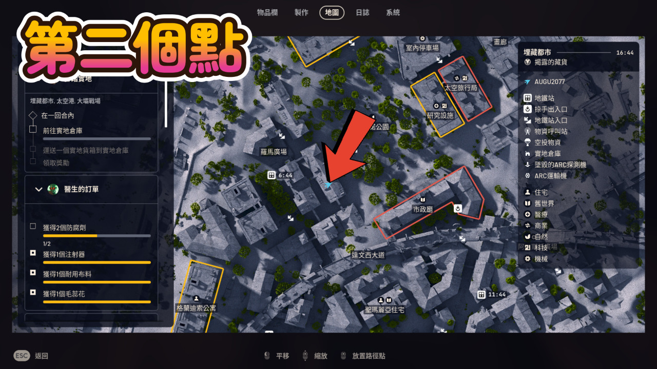 10 第十個我們到右邊的阿布斯托廣場,右下角這個點是另外一個藥房,進去可以搜到好東西,而且你速度快的話旁邊還有一個撤離出口,但我們盡量以安全為主不要趕,包包滿了就可以離開,切記不要貪戀財物。