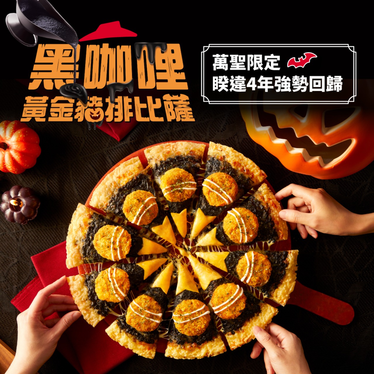 想當然必勝客萬聖節也推出黑咖哩黃金豬排披薩 限時登場,錯過再等四年! 2021年掀起熱潮的黑咖哩豬排比薩,強勢回歸! 濃郁黑咖哩,香氣十足,令人食指大動 金黃多汁豬排,嚴選豬腿肉製作,每一口都是幸福感 莫札瑞拉牽絲,搭配帕瑪森餅皮,濃厚香氣瞬間爆發 香濃咖哩、酥脆豬排、濃郁起司完美融合,打造萬聖節最邪惡、最歡樂的暗黑派對必備!