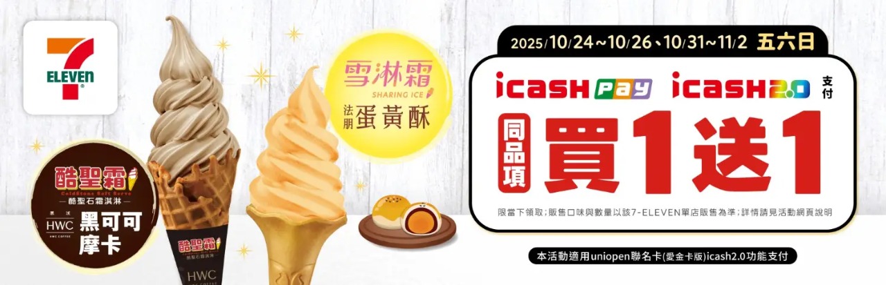 活動主題:icash Pay 7-ELEVEN霜淇淋最好Pay 活動期間:2025/10/24-10/26、10/31-11/2 活動方式:活動期間內憑icash Pay或icash2.0支付7-ELEVEN門市雪淋霜霜淇淋、酷聖石 複合店門市霜淇淋全口味品項可享買1送1優惠(限當下領取)