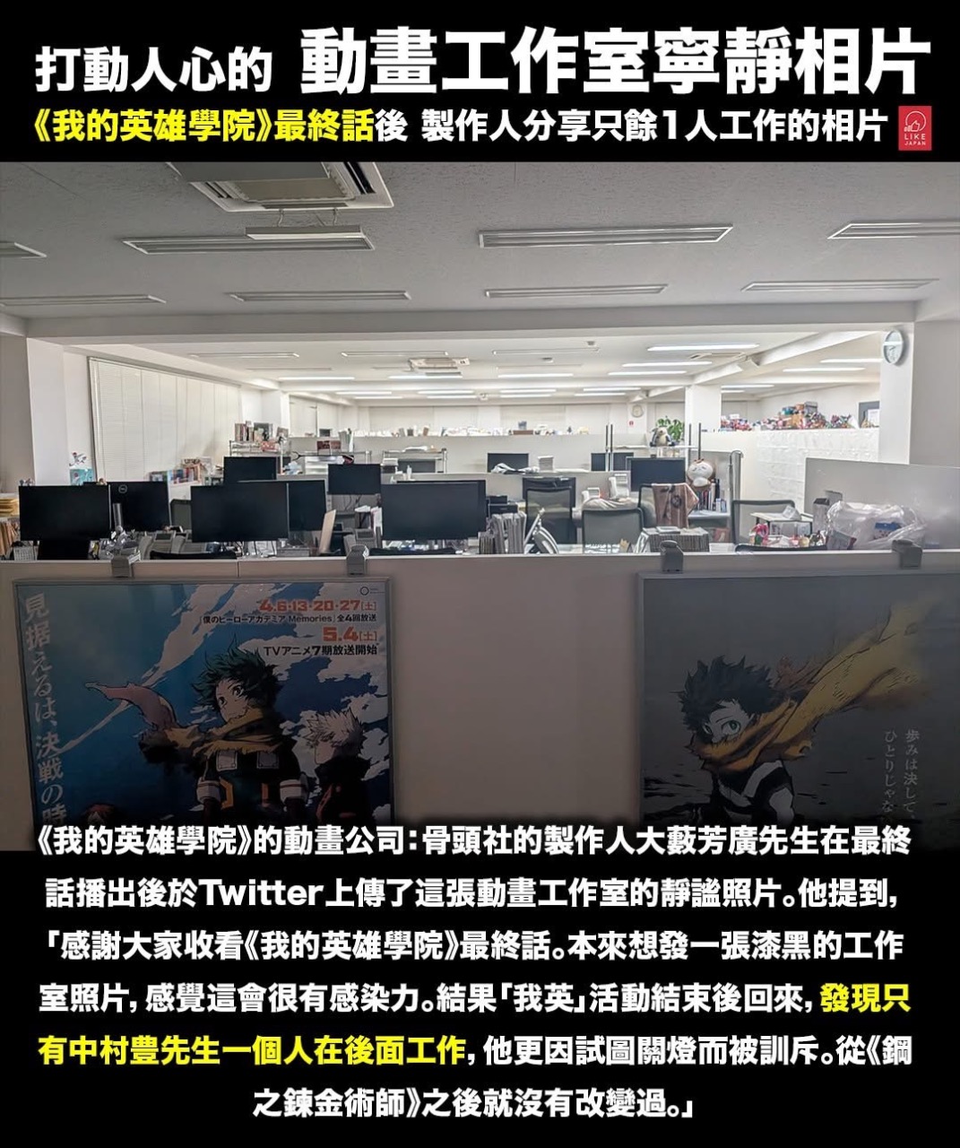 《我的英雄學院》動畫最終季雖然畫下句點,但骨頭社團隊多年來累積的製作精神,以及「Plus Ultra」所象徵的創作態度,早已深植粉絲心中。這張深夜工作室的照片,也成為獻給《我英》最溫柔、也最真實的告別。