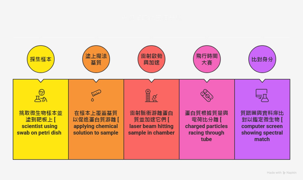 這個神奇的工具,名字聽起來很長,叫做「基質輔助雷射脫附游離飛行時間質譜法」(MatrixAssisted Laser Desorption/Ionization TimeofFlight Mass Spectrometry),簡稱 MALDITOF MS。