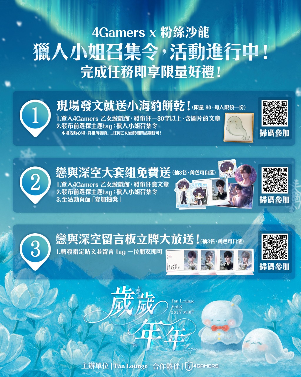 YO編久違的工商時間~ 我們與《粉絲沙龍》合作的《戀與深空》-黎深應援線下活動 就在星期天!!! 現場將有一系列《乙女遊戲館》專版的限定活動, 各種周邊好禮大放送,千萬別錯過~ 本次活動報名只到本周五,有興趣的朋友快預約起來!!! 活動資訊這邊走 報名登記在KKTIX唷